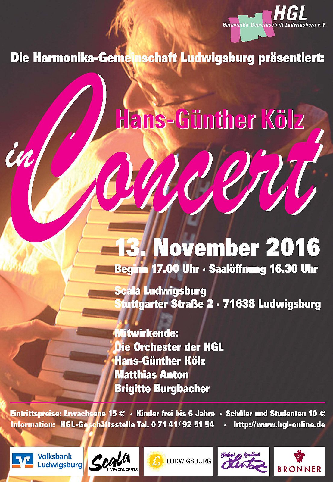 Mit Hans-Günther Kölz stand einer der international bekanntesten Arrangeure und Komponisten für Akkordeonmusik im Mittelpunkt eines Konzertes der Harmonika-Gemeinschaft Ludwigsburg. Die Veranstaltung, die mit einer ganzen Reihe beachtlicher Höhepunkte gespickt war, fand im ausverkauften Scala in Ludwigsburg statt. Neben verschiedenen Kompositionen und Arrangements des Ehrengastes war Hans-Günther Kölz auch selbst als Solist und mit seinem Duo-Partner Matthias Anton am Saxofon zu hören. Für Jubel sorgte auch die virtuose Instrumentalistin Brigitte Burgbacher an der Mundharmonika.